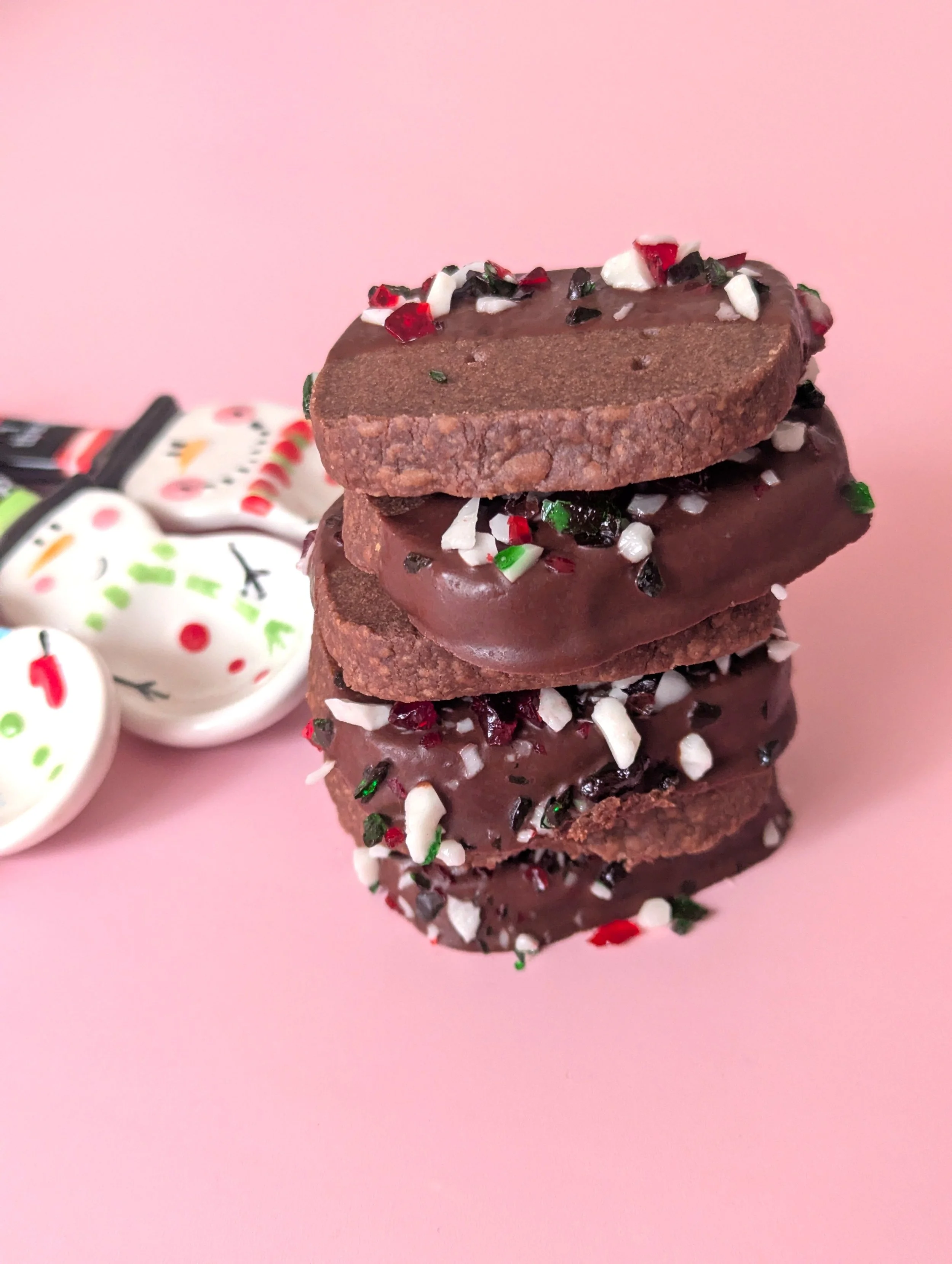 These start out with a super simple espresso infused chocolate shortbread base, then they’re dipped in dark or semisweet chocolate and decorated with the crushed candy canes for a little festive flair and minty flavour.
